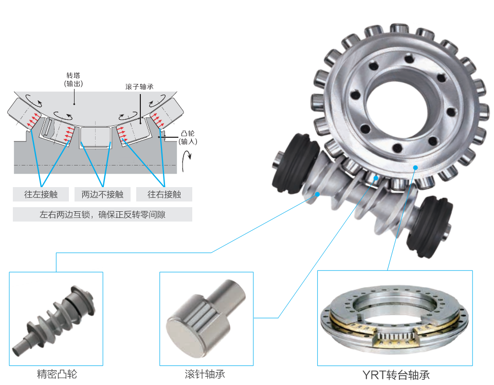 - 滾子與凸輪接觸面大 → 剛性比蝸輪蝸桿結(jié)構(gòu)轉(zhuǎn)臺更高